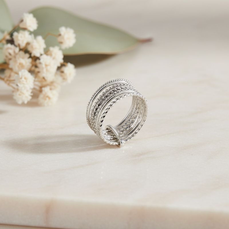 Cette bague semainier est une véritable pièce maîtresse, composé de sept anneaux délicats (alternant motifs torsadés et lisses) reliés discrètement par une barre. Chaque anneau représente un jour de la semaine, une tradition qui confère un charme unique à cette création.