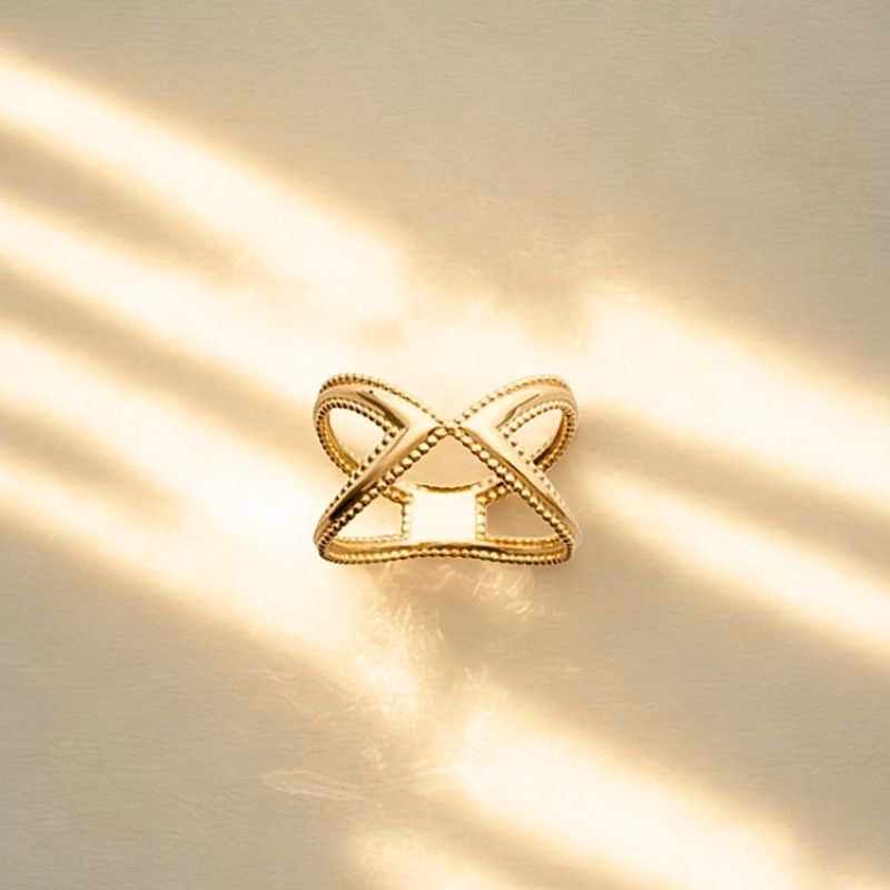 Un design à la fois moderne et intemporel pour cette bague en plaqué or 18 carats – 3 microns. Sa forme croisillon lui confère une élégance architecturale, tandis que ses bords ciselés apportent une touche de finesse et de caractère.