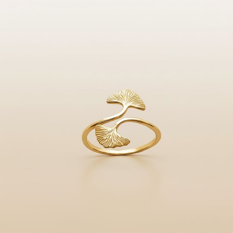 Un anneau en plaqué or 18 carats au design semi-ouvert, délicatement orné de feuilles de ginkgo, symbole de chance et de longévité. Un bijou raffiné et tendance, idéal pour ajouter une touche de poésie à votre style.