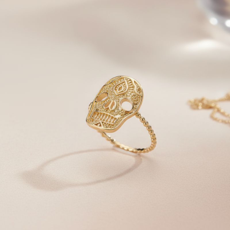 Un bijou au caractère affirmé inspiré des traditions mexicaines. Cette bague en plaqué or 750 – 5 microns arbore une tête de mort Calavera, emblème iconique du Día de los Muertos, symbole de force et de célébration de la vie.