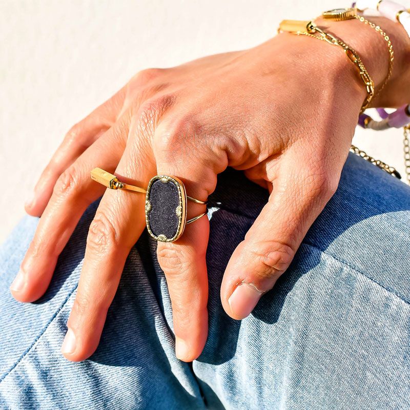 Bague en acier inoxydable ornée d’une pierre naturelle rectangulaire : Pierre de Sable Bleu
