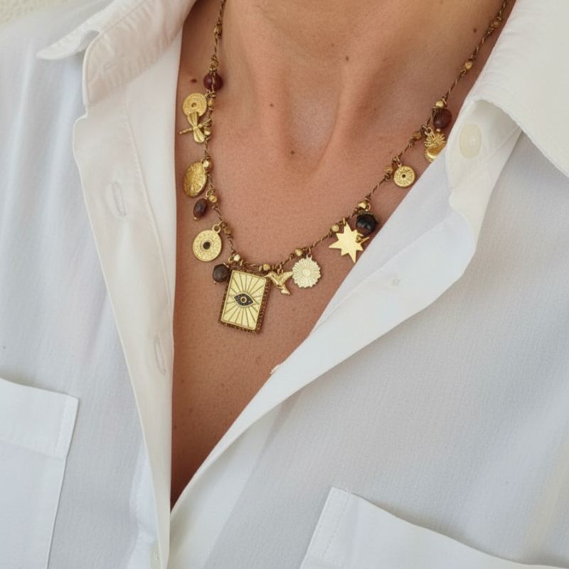 Ce collier signé MILE MILA mixe joliment les symboles porte-bonheur : étoile, œil protecteur, fleur, cœur sacré, colibri… et breloques de pierres naturelles. Monté sur un fil marron rehaussé de lurex doré, il allie douceur et éclat. Léger, réglable (de 42 à 45 cm), il se porte aussi bien seul qu’en accumulation avec d’autres colliers fins pour un effet gypsy chic garanti.