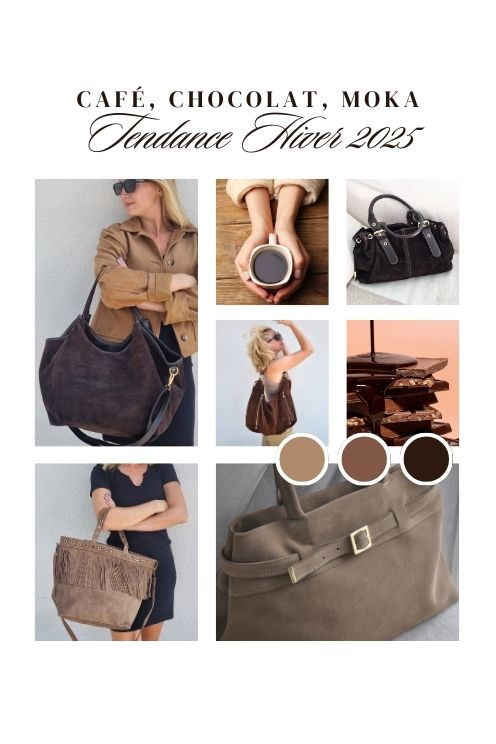 Exit le noir classique ! Cet hiver, les sacs s’habillent de teintes chaleureuses et gourmandes : chocolat intense, café profond, moka onctueux… Ces couleurs riches réchauffent la saison avec élégance…
