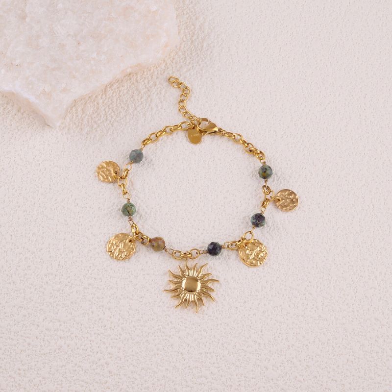 Le bracelet Solalma donne bonne mine à vos looks ! En acier inoxydable, composé d’un pendentif en forme de soleil, de pierres en turquoise africaine reconstituée et de pampilles martelées.