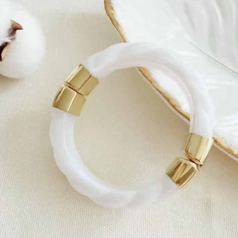 La touche blanche qui change tout. En résine blanche, minimaliste mais pas banal, il séduit par son design torsadé et son fermoir doré aimanté ultra pratique.