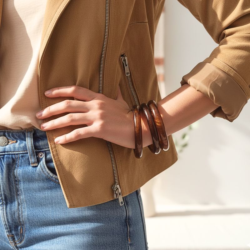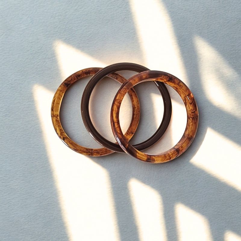 Un set de trois bracelets joncs résine signés Mile Mila, composé de deux modèles effet ambre lumineux et d’un uni chocolat. Leur style rétro chic habille instantanément vos looks, que vous les portiez ensemble ou séparément. À associer facilement avec vos bijoux dorés ou argentés.