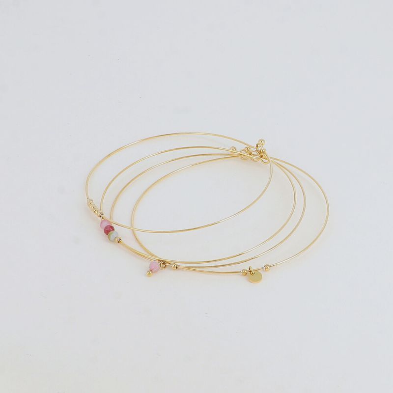 Bracelet Néora composé d’un lot de 4 joncs façon semainier en acier inoxydable, délicatement perlés et sublimés par des pierres naturelles de tourmaline. Chaque anneau joue la carte de la finesse (1 mm d’épaisseur), avec une touche de couleur qui varie au gré des pierres – c’est ce qui les rend uniques.