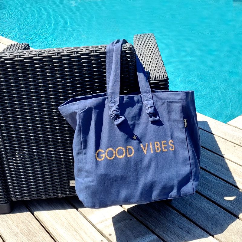 Le grand sac en coton GOOD VIBES de la marque Marcel & Lily est le sac casual chic parfait en toute saison. La couleur bleu Denim est tendance et chic, et l’imprimé pailleté or ajoute une touche de glamour. Fabriqué en France dans un coton épais certifié Oeko Tex, il mixe à la perfection style casual chic et praticité