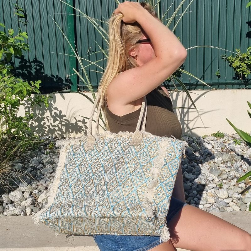 Matière naturelle, grand format et look solaire : ce cabas d’été coche toutes les cases pour vous suivre partout cet été. Que vous partiez à la plage, que vous filiez à la piscine ou que vous traîniez en ville, il assure. On aime son motif tissé turquoise et doré avec une touche bohème et naturelle.