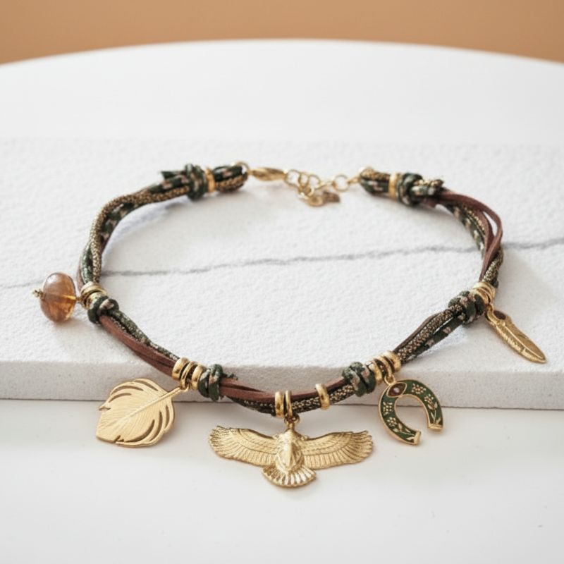 Envie d’adopter la tendance cowgirl sans changer toute votre garde-robe ? Ce collier Mile Mila est la pièce qu’il vous faut. Avec ses cordons tressés, sa touche cuir et ses charms dorés – plume, aigle, fer à cheval émaillé et perle ambrée – il capture l’esprit western chic tout en restant facile à porter. C’est le petit détail qui change tout, il donne instantanément du caractère à votre look.