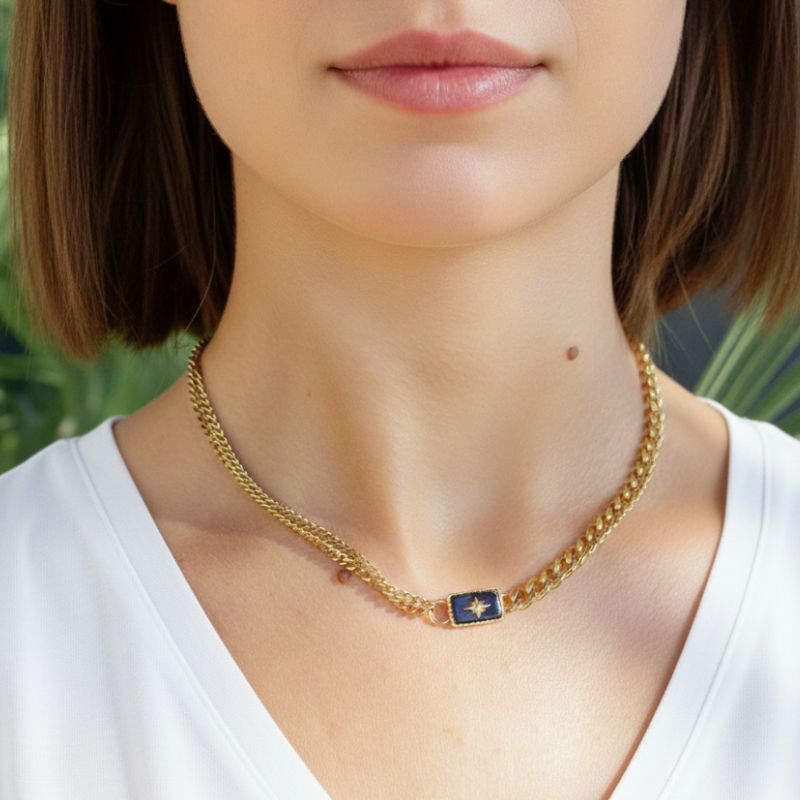 Ce collier en acier inoxydable est composé d’un maillage de chaine asymétrique fini par un pendentif rectangle orné d’une pierre naturelle ONYX