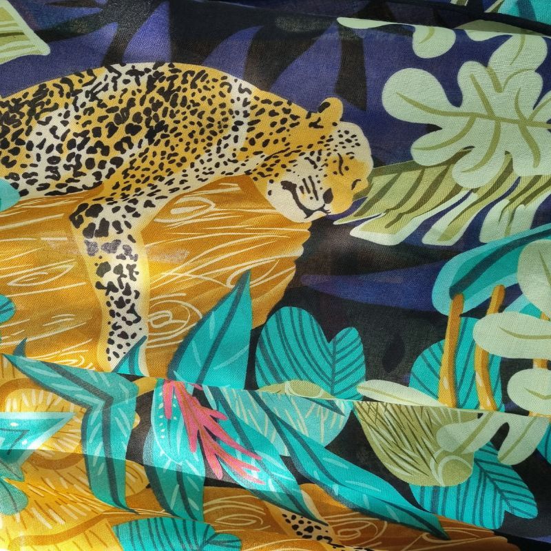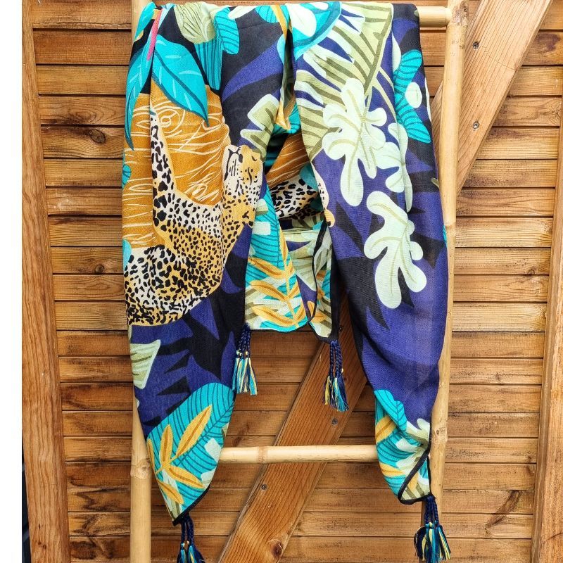 Pour la nouvelle saison, les accessoires se parent de l’imprimé animal ! Le carré « Panthère Sur Son Rocher » est une création exclusive de la marque Palme Paris. En polyester doux de 130 x 130 cm, son design exotique présente des motifs de panthère sur un fond tropical, rehaussé de pompons pour une touche élégante.