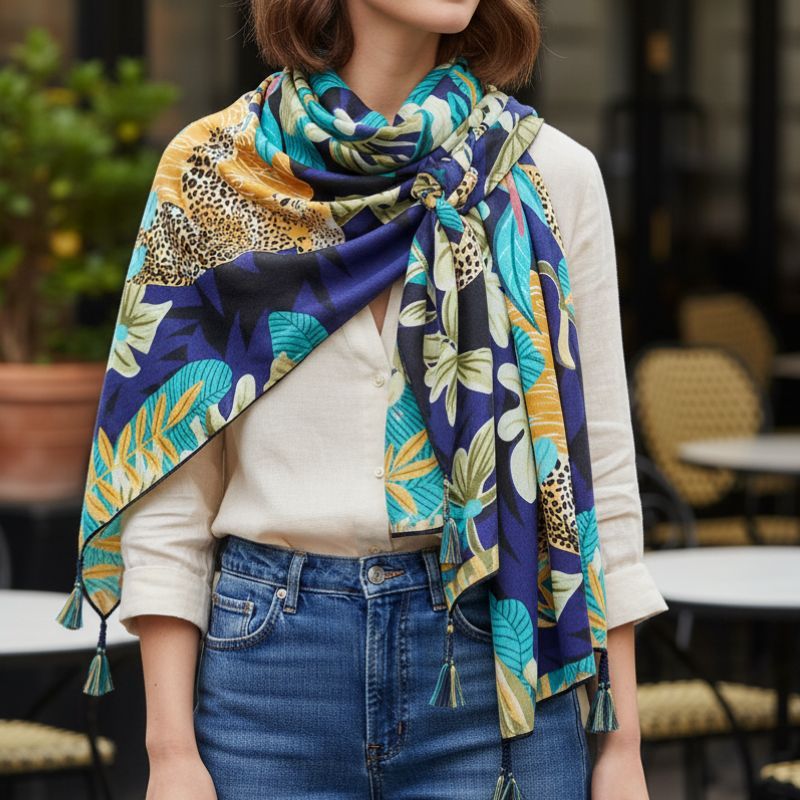 Parfait pour agrémenter vos tenues décontractées ou sophistiquées, ce carré combine style sophistiqué et chic sauvage.