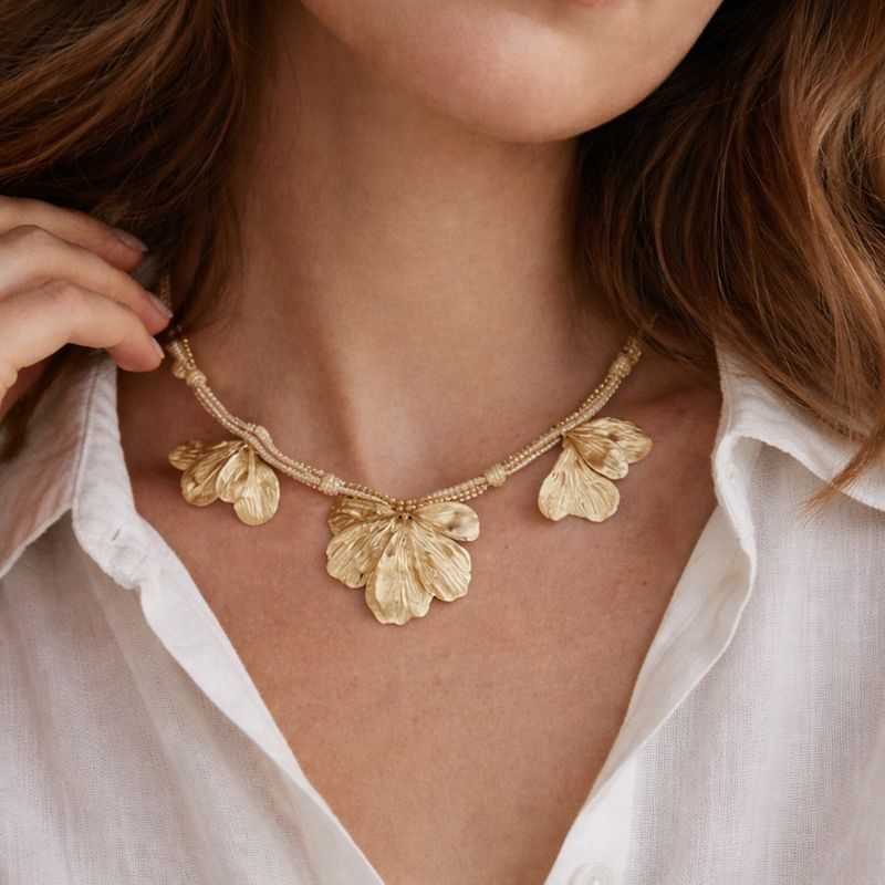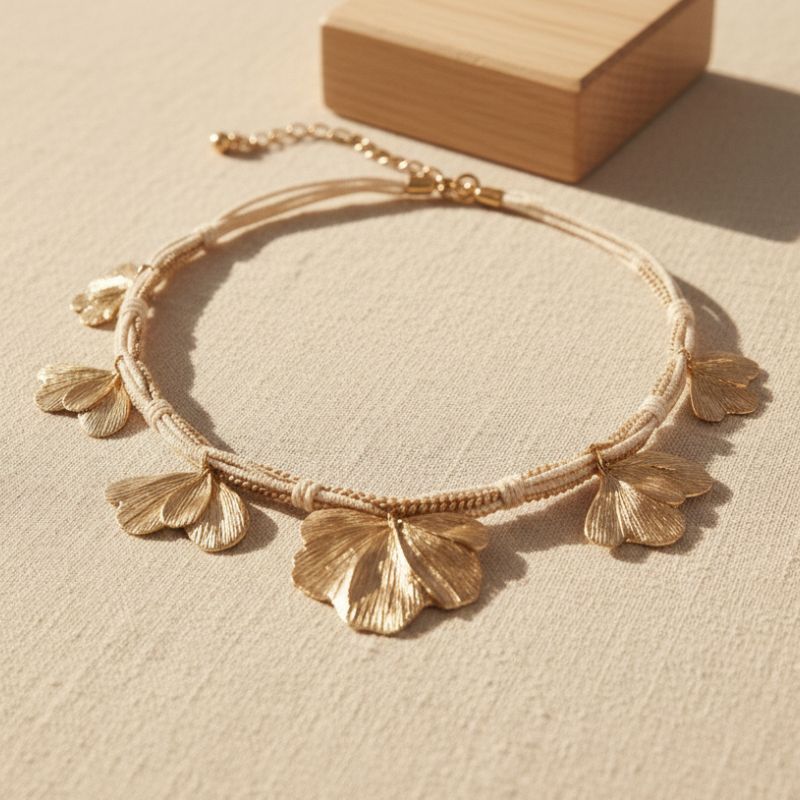 Collier ras de cou doré mêlant cordon tressé et fine chaîne, avec de jolies breloques feuilles au fini texturé. Une pièce lumineuse, féminine et facile à porter, qui apporte une touche chic et naturelle à vos looks.