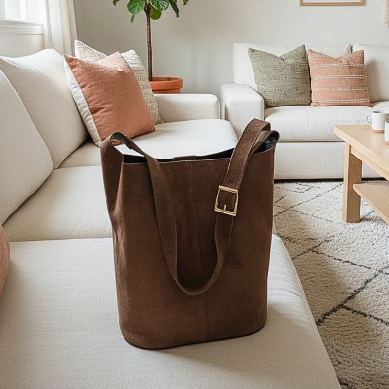 Un sac en daim au format seau structuré, élégant et bien tenu. Sa silhouette nette apporte tout de suite du style, porté à l’épaule au quotidien. Fabriqué en Italie, il séduit par la qualité de son cuir nubuck (daim) et son allure intemporelle.