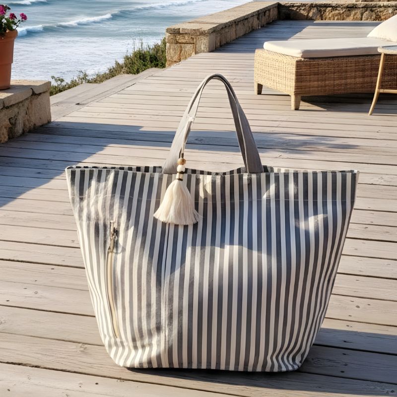 Ce sac de plage 100 % coton est l’allié parfait de vos journées au soleil. Avec des rayures gris/écru il donne tout de suite le ton : simple, efficace, facile à porter. Vous le glissez à l’épaule, et vous êtes prête.