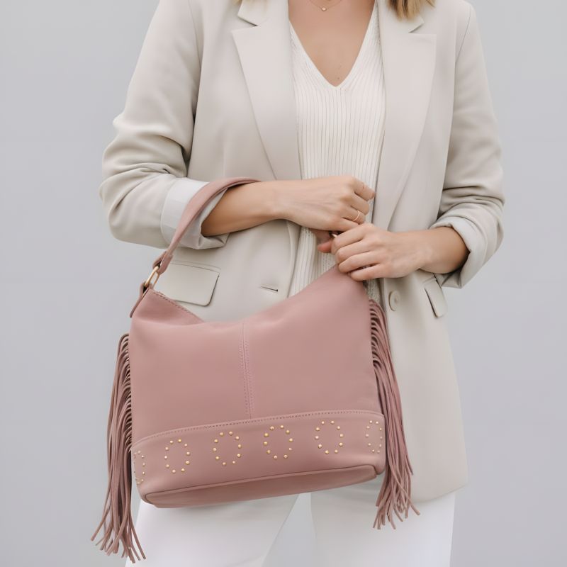 Son rose poudré flatteur, ses franges délicates et ses détails clous dorés à la base lui donnent du caractère tout en restant facile à associer.