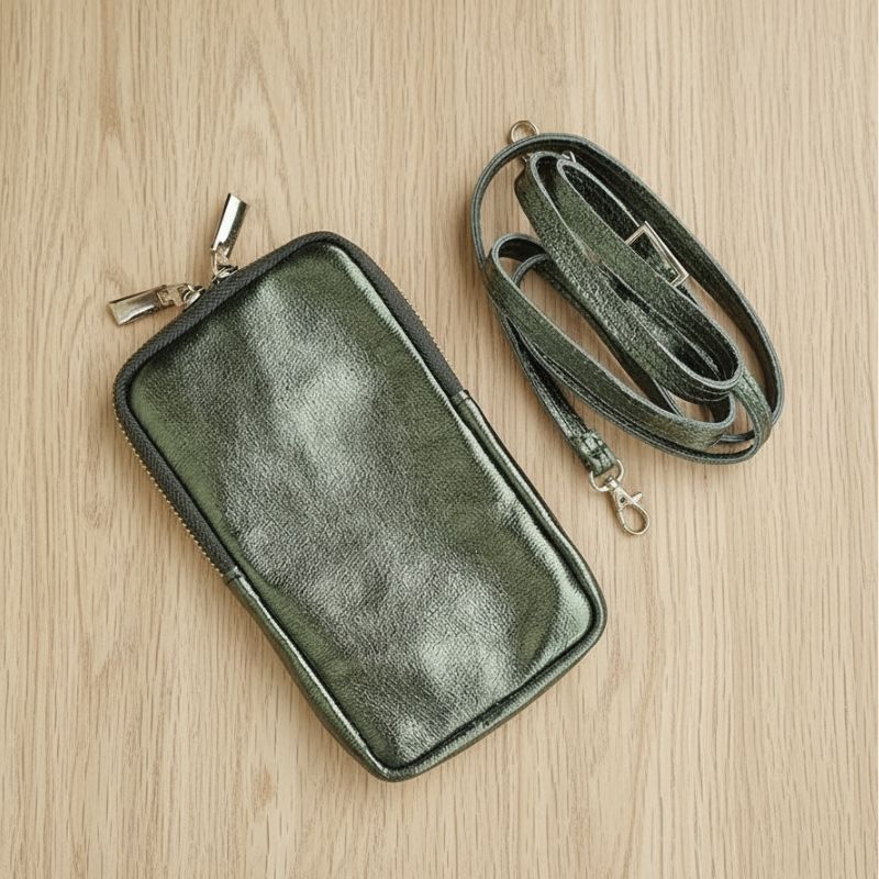 Fabriquée en Italie à partir de cuir véritable avec finition irisée, la pochette de téléphone Lou est équipée d’une bandoulière amovible, ce qui vous permet de l’utiliser comme un petit sac à bandoulière pratique. La pochette mesure 19 cm de hauteur, 11 cm de largeur et 3 cm de profondeur.