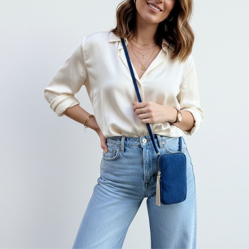 Fabriquée en Italie à partir de daim au toucher soyeux, avec finition irisée, la pochette de téléphone Leni est équipée d’une bandoulière amovible, ce qui vous permet de l’utiliser comme un petit sac à bandoulière pratique. La pochette mesure 19 cm de hauteur, 11 cm de largeur et 2 cm de profondeur.
