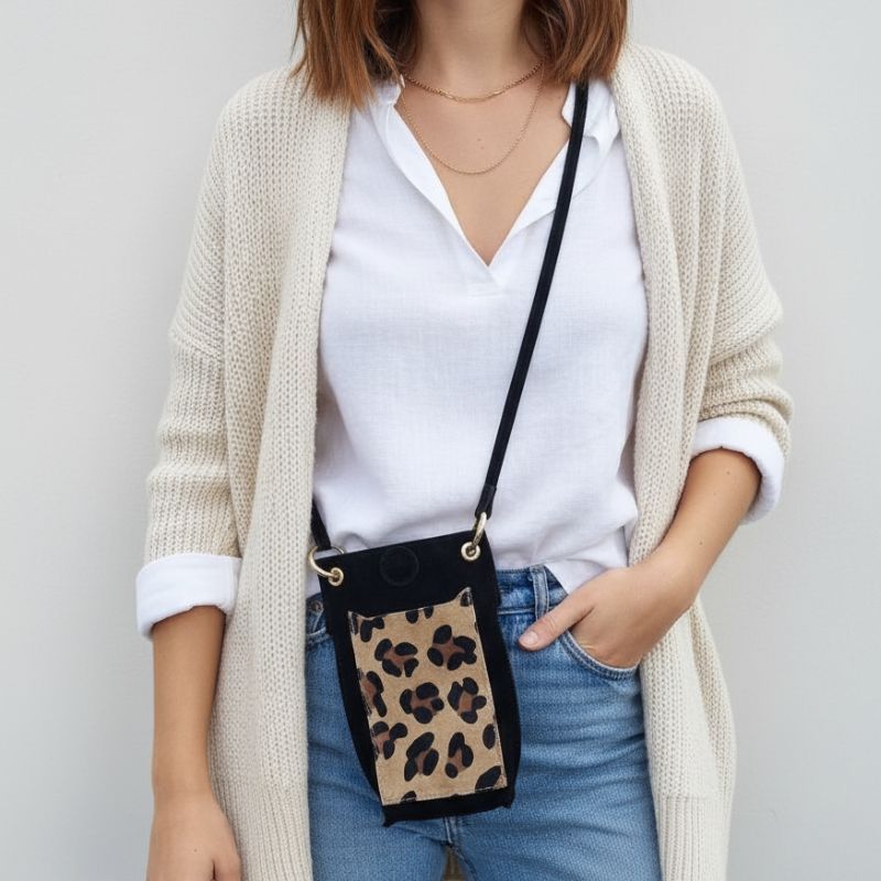 La pochette en daim Eliora garde votre téléphone bien protégé, tout en ajoutant une dose de style à vos looks. Son imprimé léopard à l’avant fait toute la différence : un détail sauvage qui attire le regard sans en faire trop. La sangle réglable permet de la porter à l’épaule ou en bandoulière, selon l’envie du moment.