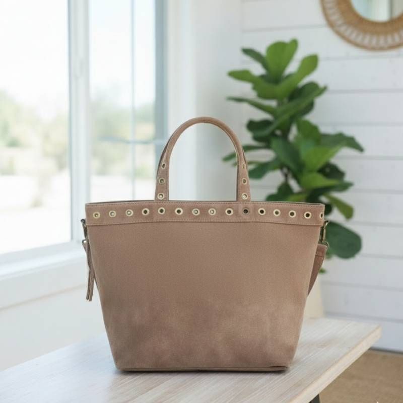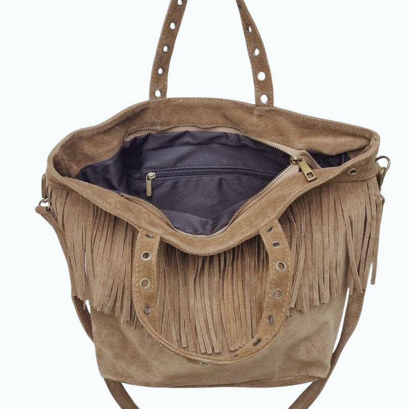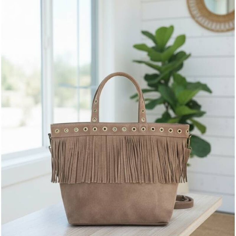 Flavie, le cabas à franges qui en jette ! Ce cabas en daim fabriqué en Italie a ce petit truc en plus qui fait toute la différence : une rangée de longues franges ultra stylées, soulignées par une ligne d’œillets métalliques qui lui donnent un look folk-rock assumé.
